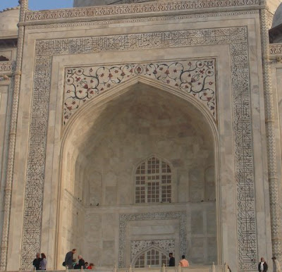 Bands of beautiful inlay work, using the 'pietra dura' technique, adorn the outer walls of the Taj....jasper, jade ,coral and yellow marble have been inrticately cut, shaped and polished to make these inlays that give the impression of having been created through the sweep of a paint brush....the pieces used for the inlay are so small and delicate that the artisans would often lose skin off the tips of their fingers...it is this fact that gave birth to the legend which says that Shahjahan had the hands of the artisans chopped off so another monument to rival the beauty of Taj could never be built!!