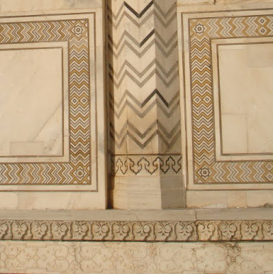 One design element that shows up repeatedly on the outer wall of the Taj is herringbone inlay on large wall panels ....